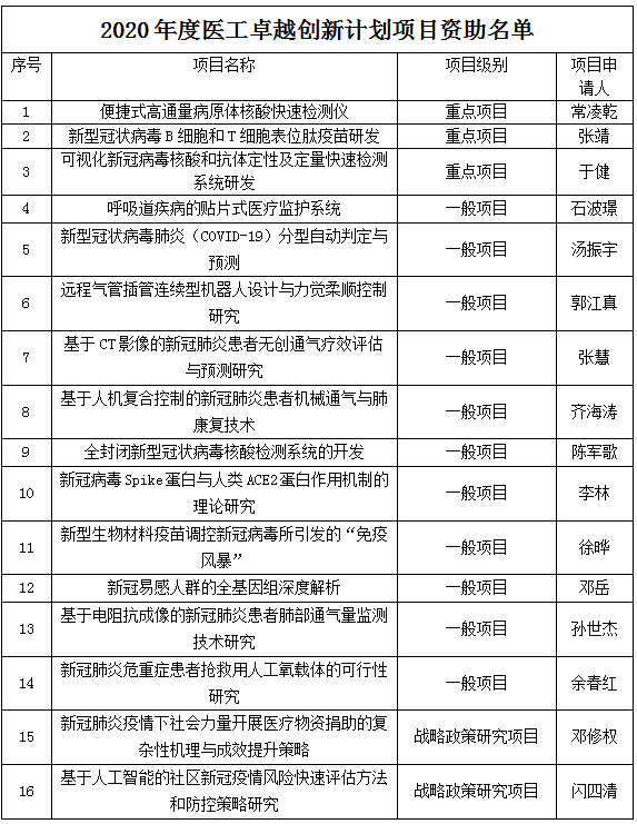 为加快推进建设扎根中国大地的世界一流大学,面向健康中国的发展目标,坚定不移地实施优势医工战略、推动医工交叉融合,科学技术研究院和yl23411永利特设置医工卓越创新计划项目。本着“公开、公平、公正、择优”的原则,根据评审结果综合排序,2020年度医工卓越创新计划项目共入选16项。