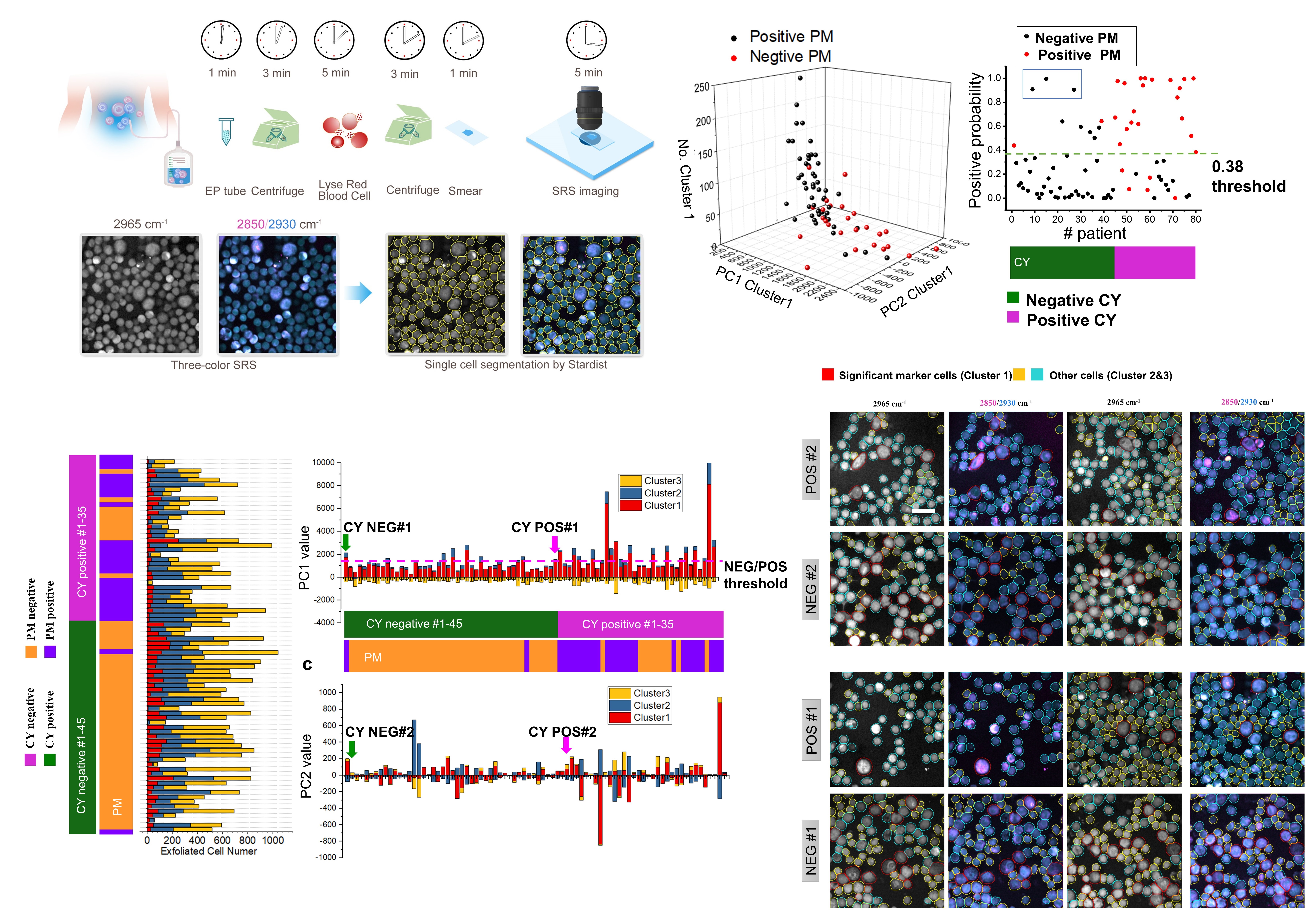 受激拉曼散射显微成像是一类新兴的无需荧光标记的分子成像技术,近年来为肿瘤代谢和诊断的研究提供了有力手段。本研究基于受激拉曼散射的单细胞分子成像,首先采集胃癌腹腔脱落细胞的脂质、蛋白、核酸3个通道的原位图像,再利用深度学习网络实现高精准的单细胞分割,接着提取和筛选在阴性和阳性病例中具有显著差异的12个单细胞形态和成分特征,然后利用PCA降维和K-means聚类方法,识别出脱落细胞中指示阳性和阴性的细胞亚群(significant marker cell cluster),从而实现胃癌腹膜转移的精准诊断。经80个病例(53951个脱落细胞)的实验验证,结果显示,该方法在20分钟内实现单病例的腹腔脱落细胞检测,腹膜转移的诊断灵敏性和特异性达到81.5%和84.9%,AUC达到0.85。而且,本研究还发现单细胞形态特征主要贡献了诊断特异性,而单细胞成分特征主要贡献了诊断灵敏度,这也就很好地解释了受激拉曼散射分子成像能够显著提高诊断灵敏度的原因。