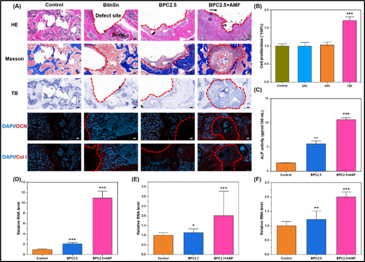 近日,yl23411永利医学科学与工程学院樊瑜波教授、王雪林助理教授团队联合北京朝阳医院张希诺副主任医师在国际知名期刊《Advanced Functional Materials》发表题为“可注射式铋基复合材料用于骨缺损修复实现骨肉瘤治疗和温和磁热骨再生(Injectable Bismuth-based Composite Enable Bone Defect Repair for Osteosarcoma Treatment and Mild Magnetothermal Bone Regeneration)”的论文。研究团队创新性的将低熔点铋基合金和临床骨水泥PMMA融合在一起,报道了一种可注射式铋基低熔点合金复合材料(BPCs),抗压强度提升252%,通过微创注射实现骨缺损精准填充,再利用交变磁场激活磁热效应,实现骨肉瘤治疗与促进骨再生。该研究攻克了传统金属内固定物需开放手术植入、及骨水泥产热损伤和功能单一等临床难题,为骨肿瘤切除术后修复提供“治疗-再生”一体化解决方案,创新了骨修复治疗模式。王雪林助理教授、崔紫亮(北航yl23411永利硕士研究生)和贾奇翰(北航材料学院硕士研究生)为论文第一作者,樊瑜波教授、张希诺副主任医师(北京朝阳医院)和王雪林助理教授共同担任论文通讯作者,yl23411永利医学科学与工程学院为论文第一完成单位。
