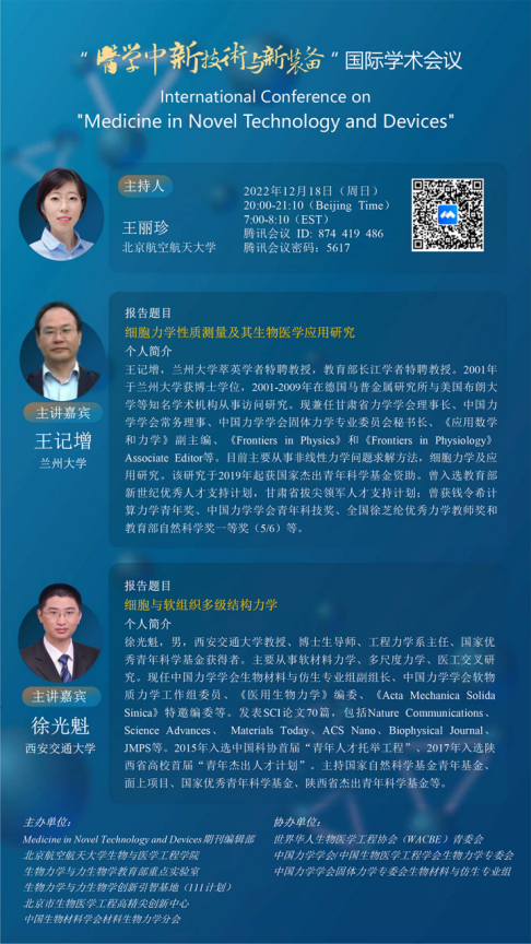 本次会议由Medicine in Novel Technology and Devices期刊编辑部、yl23411永利生物与医学工程学院、生物力学与力生物学教育部重点实验室、生物力学与力生物学创新引智基地(111计划)、北京市生物医学工程高精尖创新中心、中国生物材料学会材料生物力学分会主办,由世界华人生物医学工程协会(WACBE)青委会、中国力学学会/中国生物医学工程学会生物力学专委会、中国力学学会固体力学专委会生物材料与仿生专业组协办,医学中新技术与新装备国际学术会议将于2022年11月-12月以线上方式举办。