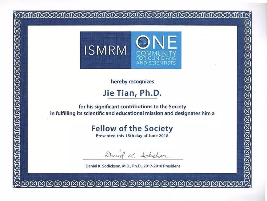 国际医用磁共振学会于1994年由医用磁共振学会和磁共振成像学会合并成立,是医用磁共振成像领域最大的国际学术组织,拥有正式会员近8000人。2018年ISMRM年会参会人数超过6000人,再创历史新高。ISMRM Fellow是经过学会内部严格的层层筛选后授予该领域专家的顶级学术荣誉,最终当选者均为在磁共振成像方法技术和临床应用方面具有突出贡献的学者。田捷教授是目前为止唯一一位来自中国大陆的信息技术背景的ISMRM Fellow,说明田捷教授在医工交叉领域的相关工作在国际学术界具有相当的影响力,获得了临床医学专家的认可。