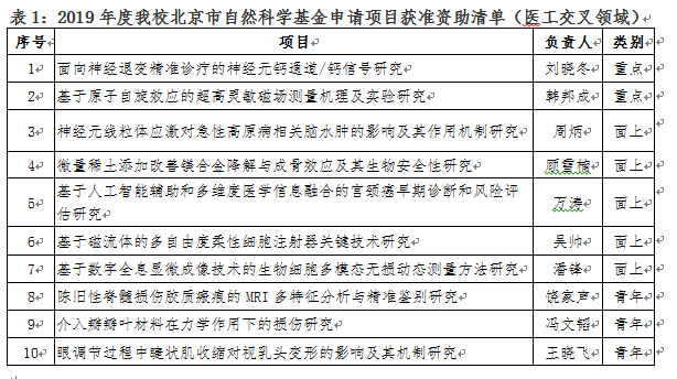 近日,北京市自然科学基金委员会办公室公布了2019年度北京市自然科学基金拟资助项目名单。在集中申报期,我校在医工交叉领域共有10个项目获批,其中重点2项,面上项目5项,青年项目3项。在此前公布的2018年度北京市自然科学基金-海淀原始创新联合基金拟资助项目名单中,我校在医工交叉领域获批重点研究专题2项,前沿项目2项。