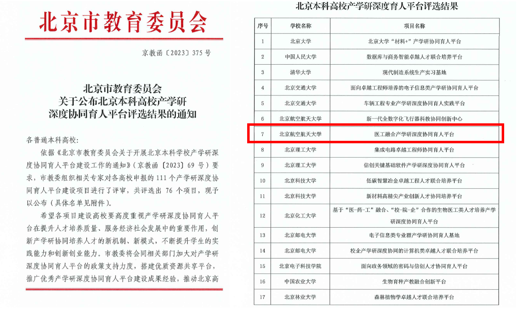 近日,北京市教育委员会公布了2023年北京本科高校产学研深度协同育人平台评选结果,由北航生物与医学工程学院牵头协同医学科学与工程学院申报的“医工融合产学研深度协同育人实践平台”成功获批,为我校创建国内一流产学研实践平台目标的实现再添助力。
