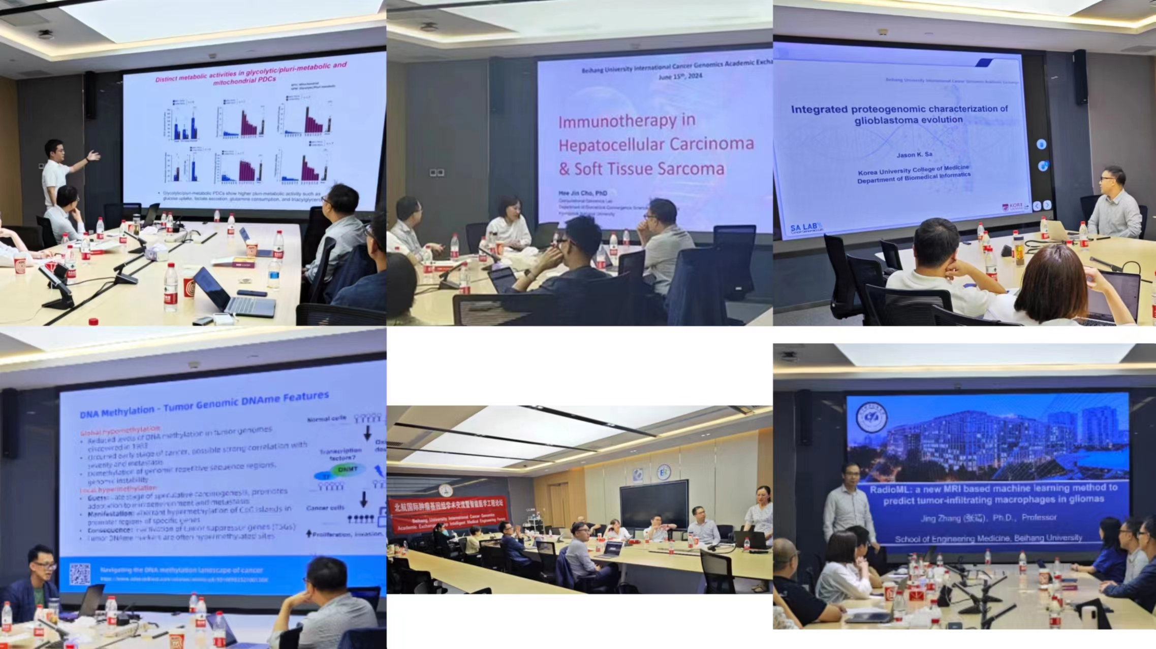 会上,来自韩国高丽大学的Jason Kyungha Sa副教授(美国)、江源大学的Young Taek Oh副教授(韩国)、庆北大学Hee Jin Cho副教授(韩国),就其团队在肿瘤基因组学方面取得最新研究进展进行交流分享。北航yl23411永利的张靖教授、于健教授、张大可副教授、李春燕副教授、史微副教授、杨昀副教授、孙婷博士参与了学术交流并介绍了他们最新的研究成果。与会专家学者着重探讨了应用肿瘤基因组学剖析淋巴瘤、脑胶质瘤、肝癌、肺癌、肉瘤等机制方面取得的最新成果,以及肿瘤早期诊断新方法、新靶向药以及药物递送方法等新技术。