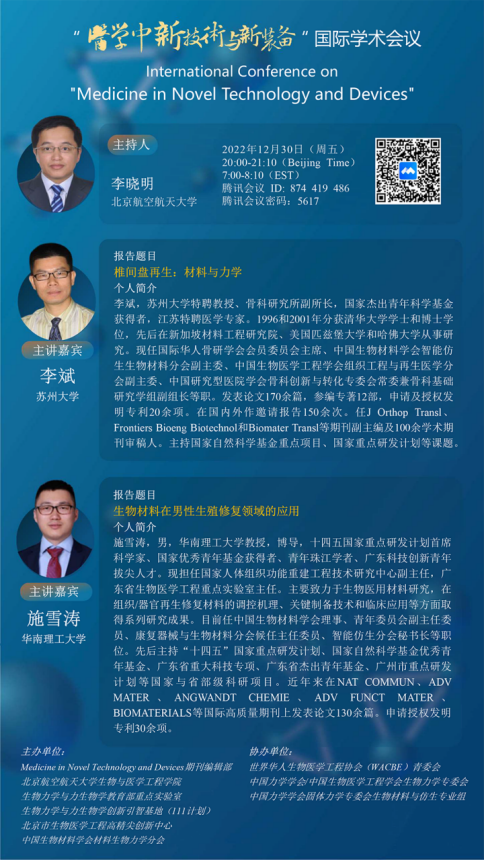 主题: 2022年 “医学中新技术与新装备”国际学术会议 12月30日晚线上会场International Conference on “Medicine in Novel Technology and Devices”, 20222022年“医学中新技术与新装备”国际学术会议(入选2022年度中国科协重要学术会议指南) 大会主席:樊瑜波 教授 12月30日晚线上会场报告时间:2022-12-30,20:00-21:10 (周五) 地点:腾讯会议ID:874-419-486;会议密码:5617报告主题:椎间盘再生:材料与力学邀请专家:李斌 教授 苏州大学 专家简介:李斌,苏州大学特聘教授、骨科研究所副所...